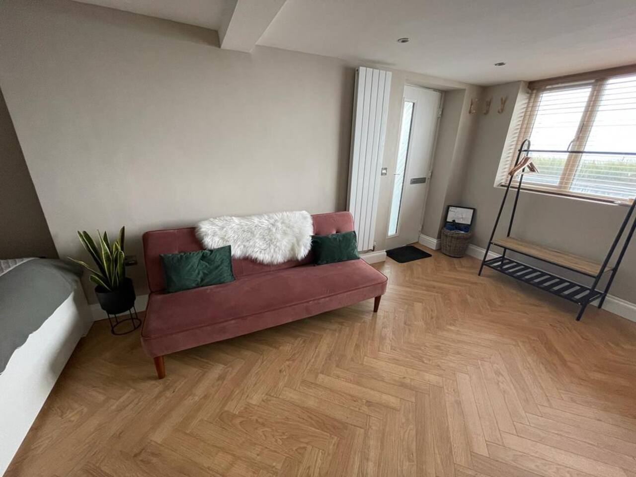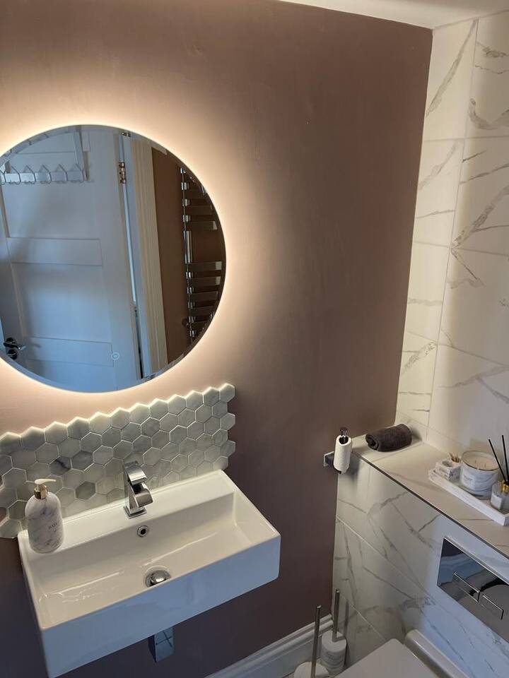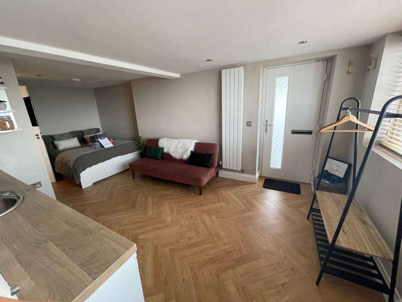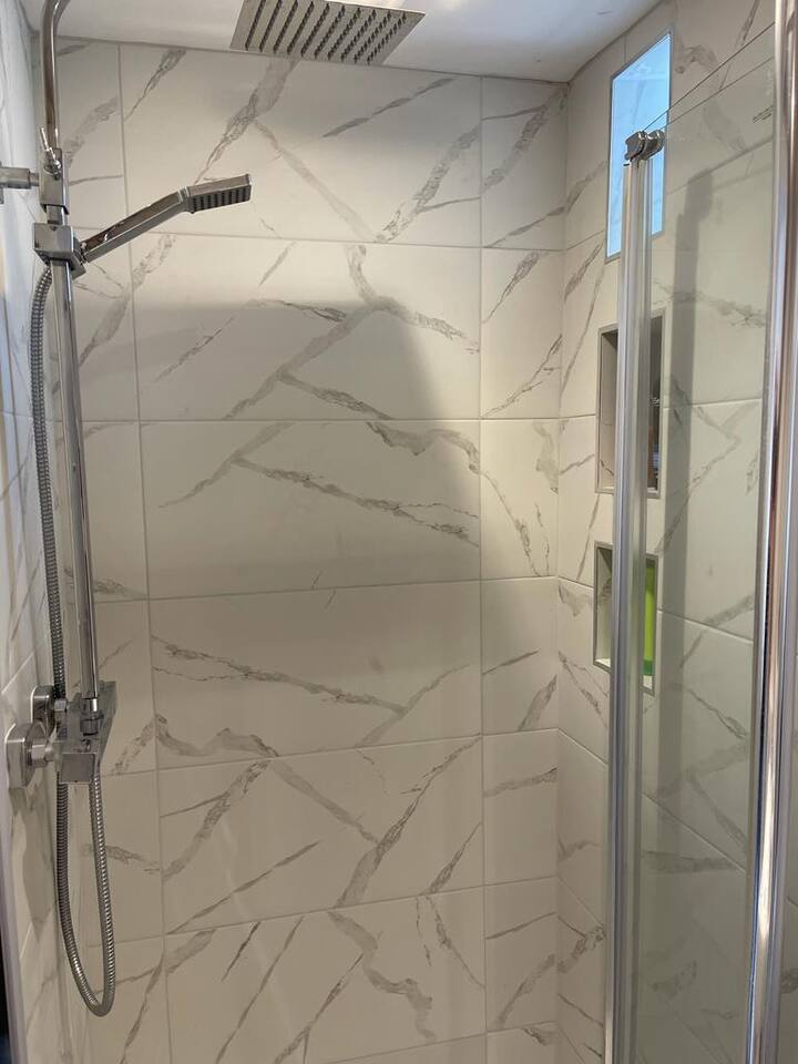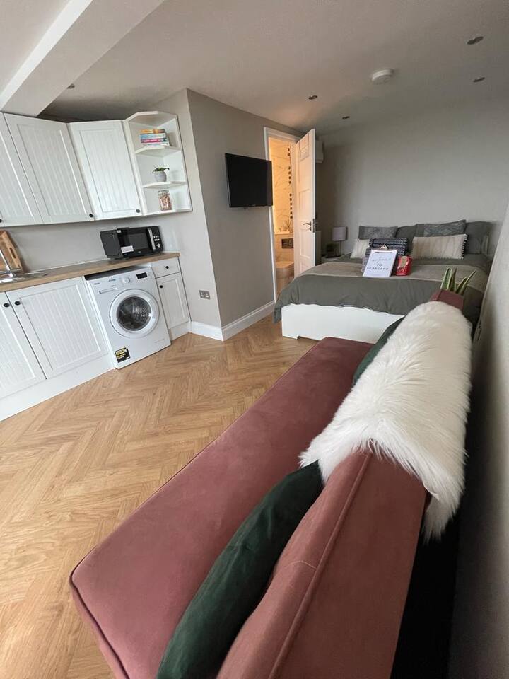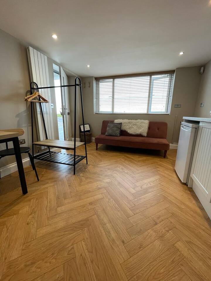 A cozy yet stylish ground floor studio fit for all guests needs including a bathroom with shower and kitchen area